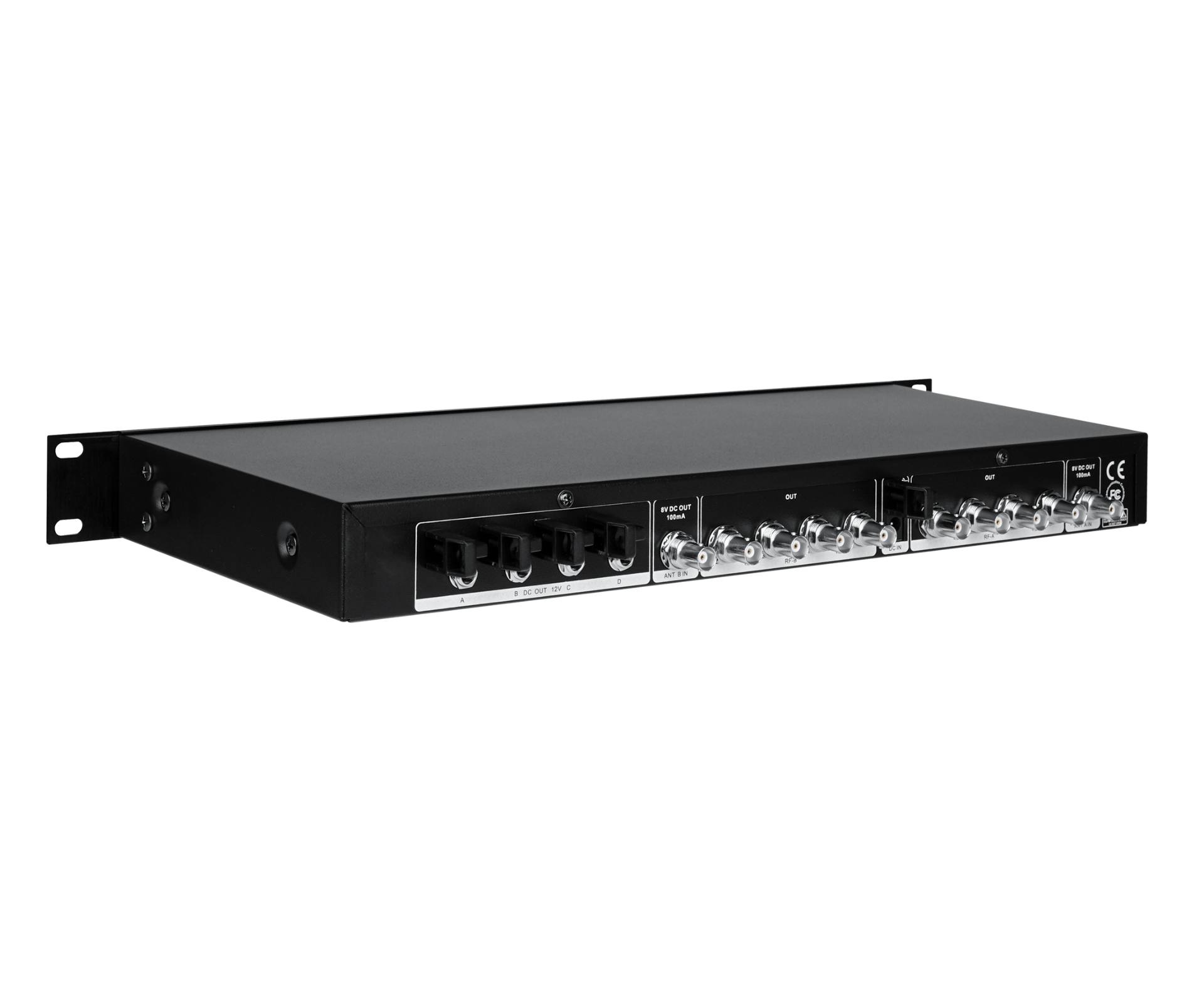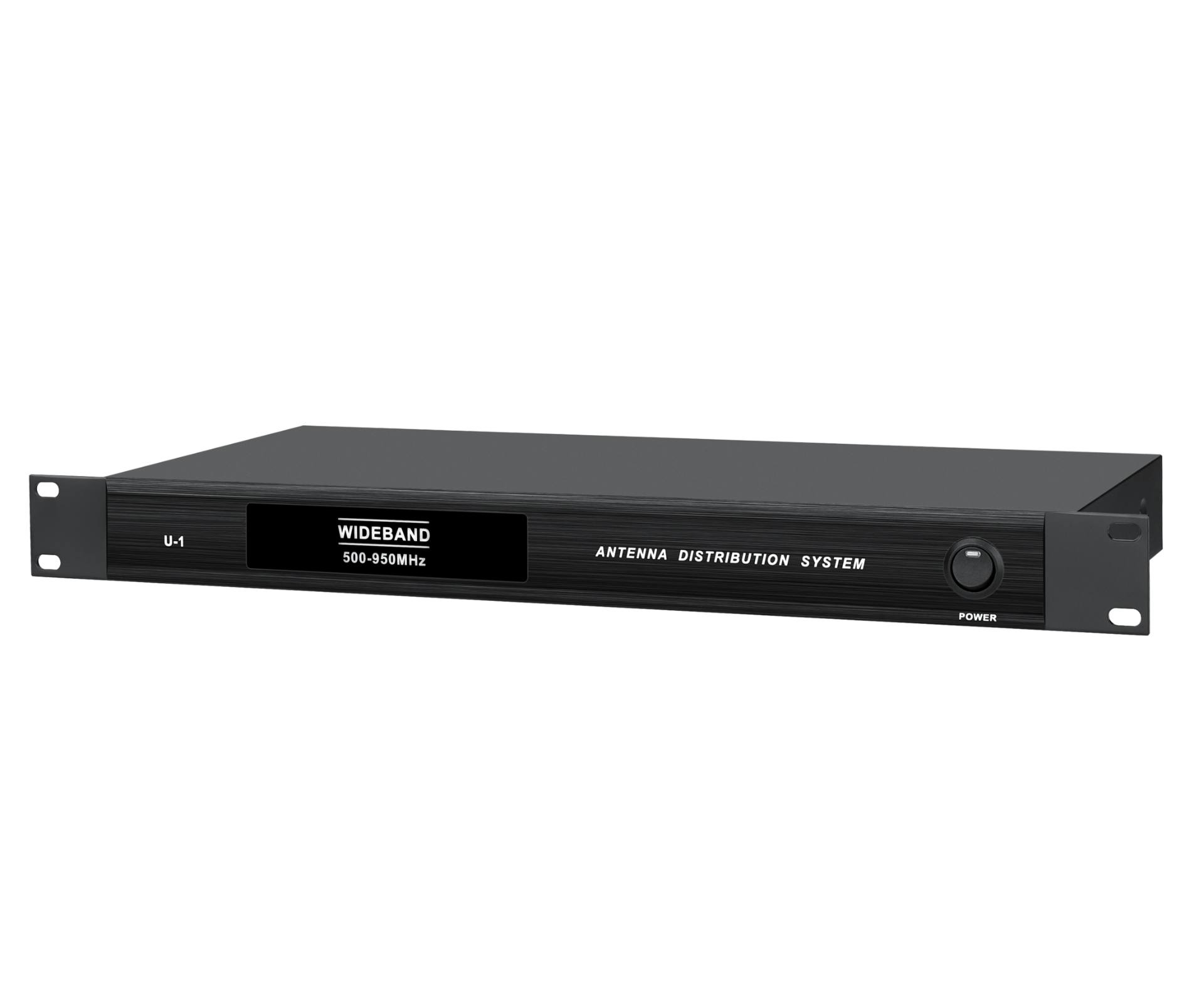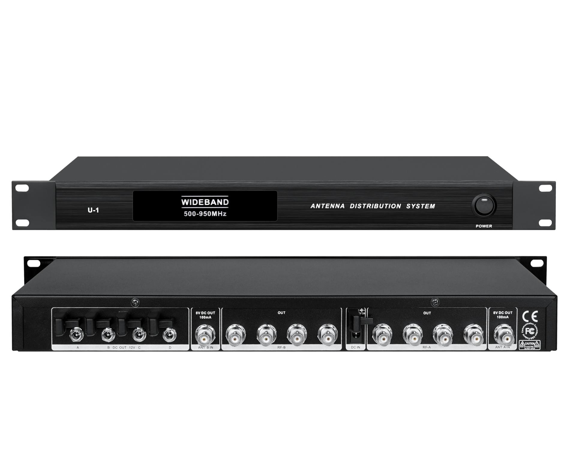 天线分配器是全频道的UHF天线分配器,它可以在多频道系统中导引天线讯号从一对天线到多台接收机。分配器会放大射频讯号以弥补在分配过程中的衰减。外置3安开关电源,可提供四组12v直流电给无线接收机。单一台天线分配器主机可支援最多16个天线通道端口。