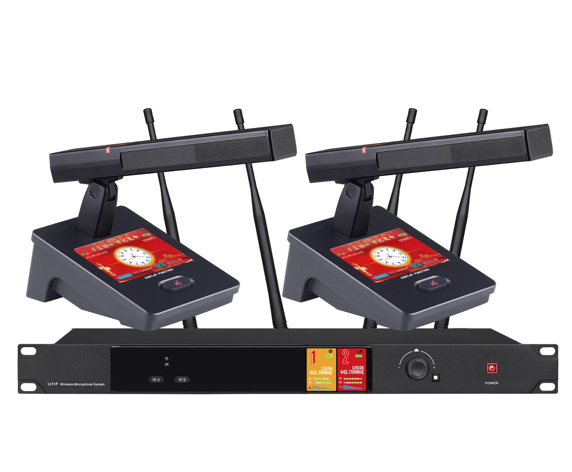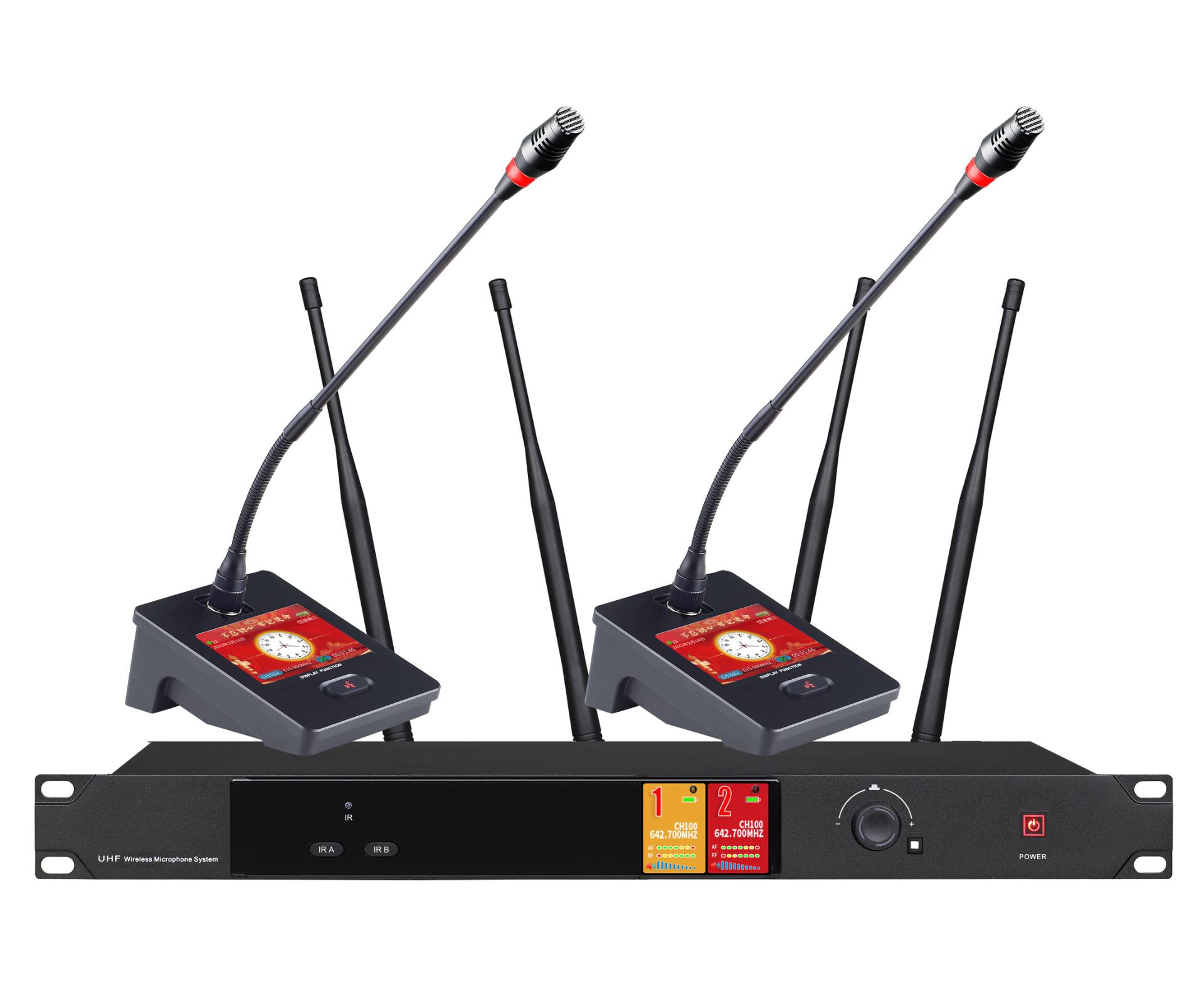 6.接收主机机采用2.69寸彩色TFT屏,可动态显示系统信号、音量、通道、频点数值。单元和接收机通信后数字彩色;