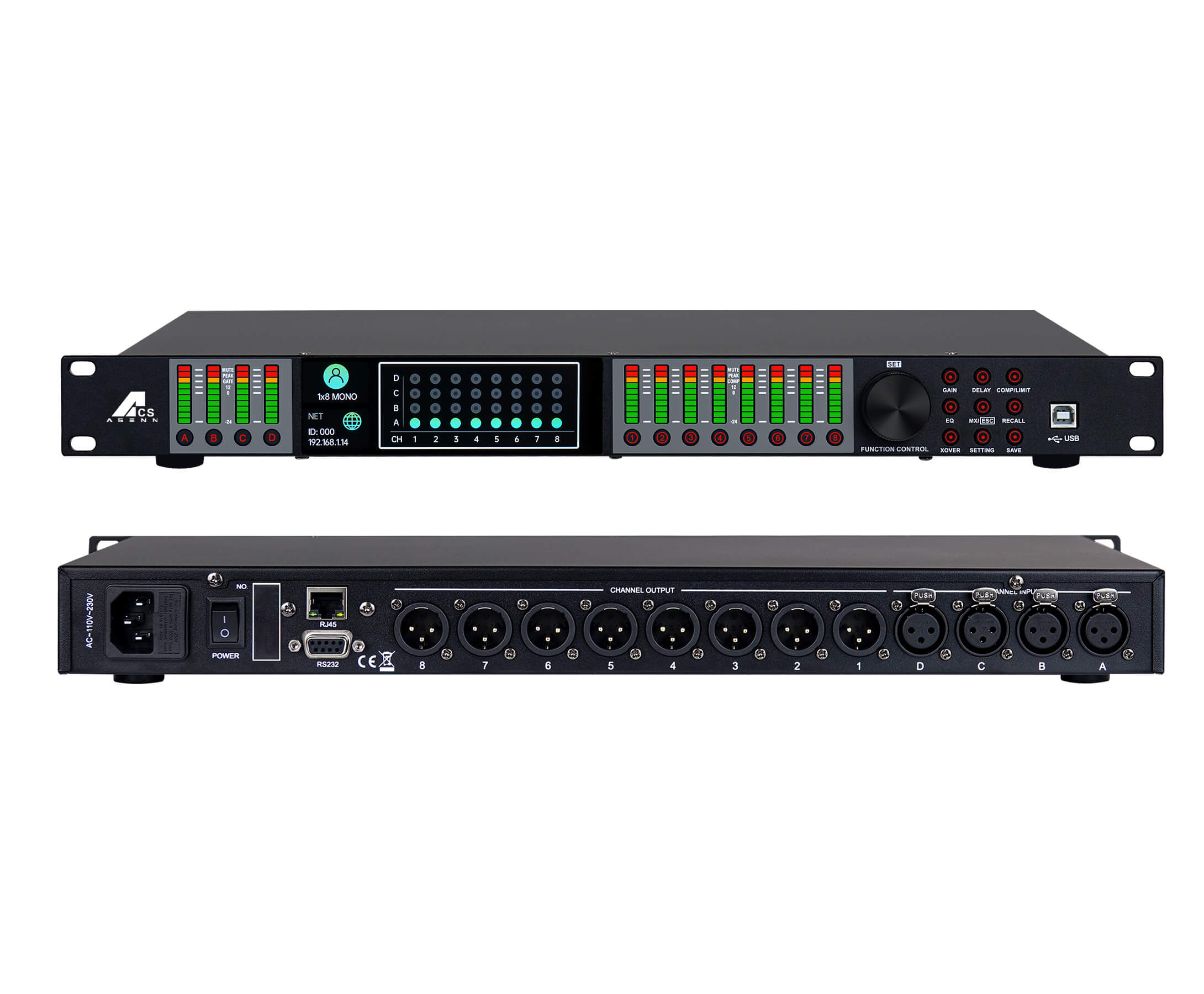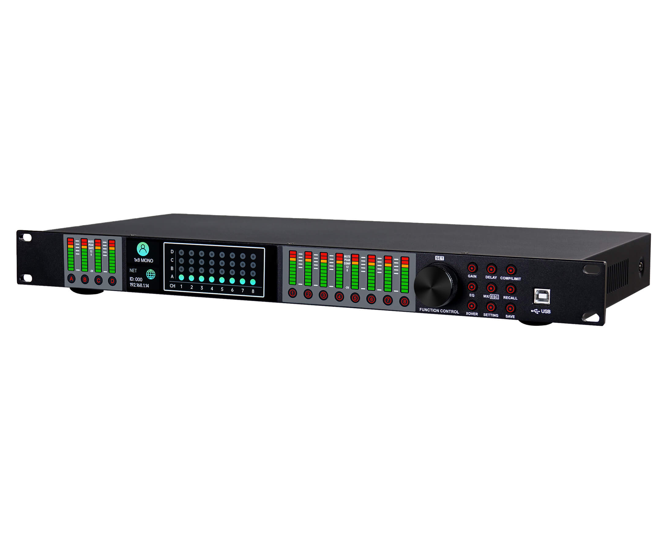LD4.8使用了先进的双核DSP技术,支持64位浮点运算。ADC部分使用了768Khz/32-bit高性能音频变换器,所有的算法都是通过一对500MHz高性能DSP处理,数字处理包括:增益、极性转换、动态均衡器、图示均衡器、参量均衡器棚架滤波器、时间延时、分频、压限和信号路由。所有输入和输出都是使用差分平衡放大,提高信号的抗干扰能力和信号完整性。